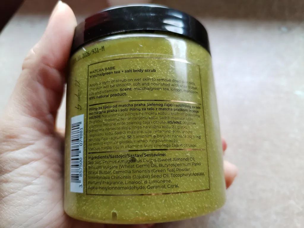 Ingredients/Sastojci: Sea Salt, Prunus Amygdalus Dulcis (Sweet Almond) Oil, Triticum Vulgare (Wheat Germ) Oil, Butyrospermum Parkii (Shea) Butter, Camellia Sinensis (Green Tea) Powder, Simmondsia Chinensis (Jojoba) Seed Oil, Tocopheryl Acetate, Parfum/ Fragrance, Linalool, d-Limonene, Alpha-Hexylcinnamaldehyde, Geraniol, Citral.