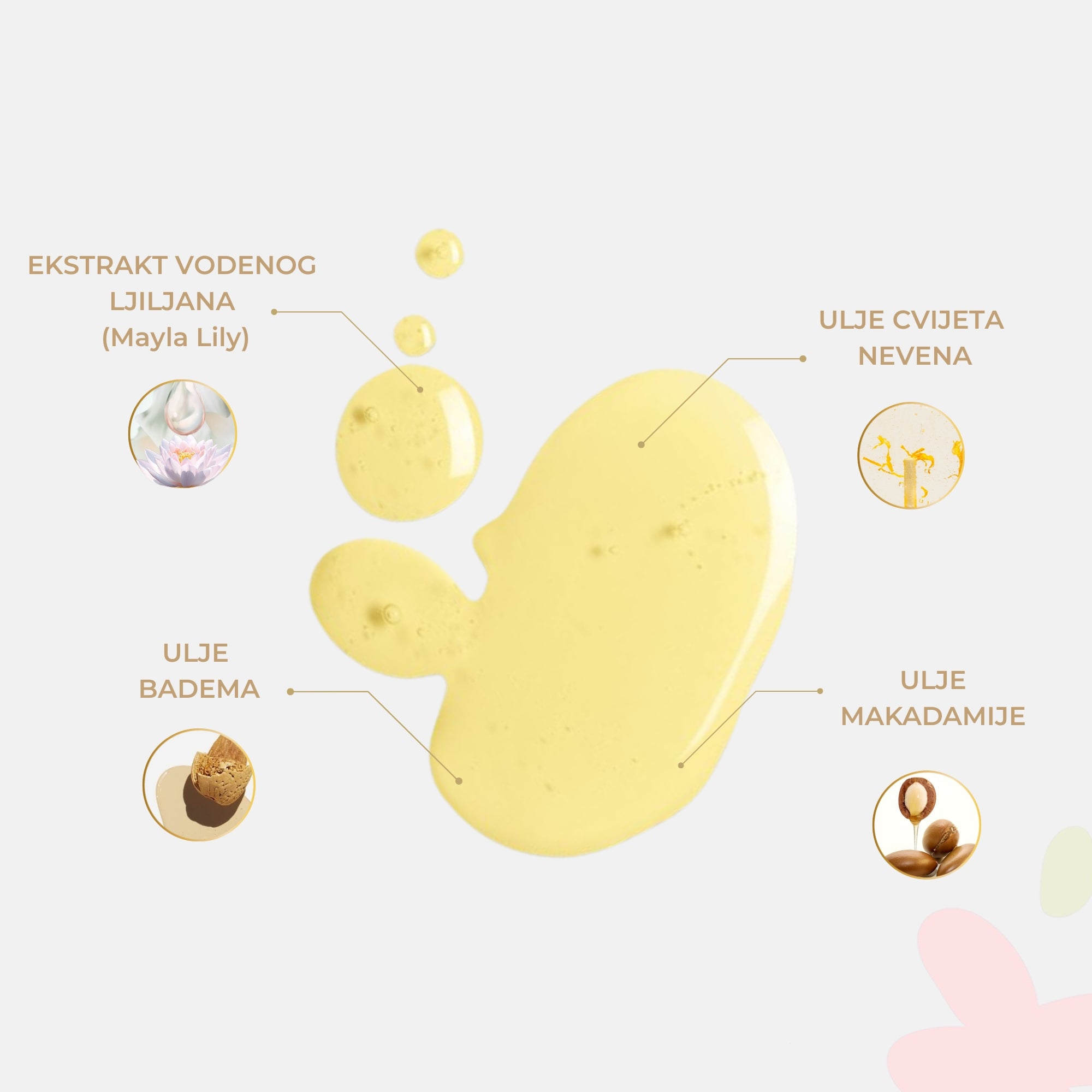 Nježna i lagana 2 u 1 formula — ulje za njegu i kupku — idealna za svakodnevnu njegu osjetljive kože djece. Obogaćeno četiri hranjiva prirodna ulja, ekstraktom cvijeta vodenog ljiljana (Mayla Lily) i vitaminom A, ovo ulje pruža dubinsku njegu, mekoću i zaštitu kože. Može se koristiti izravno na koži ili dodati u kupku za nježno čišćenje i hidrataciju.